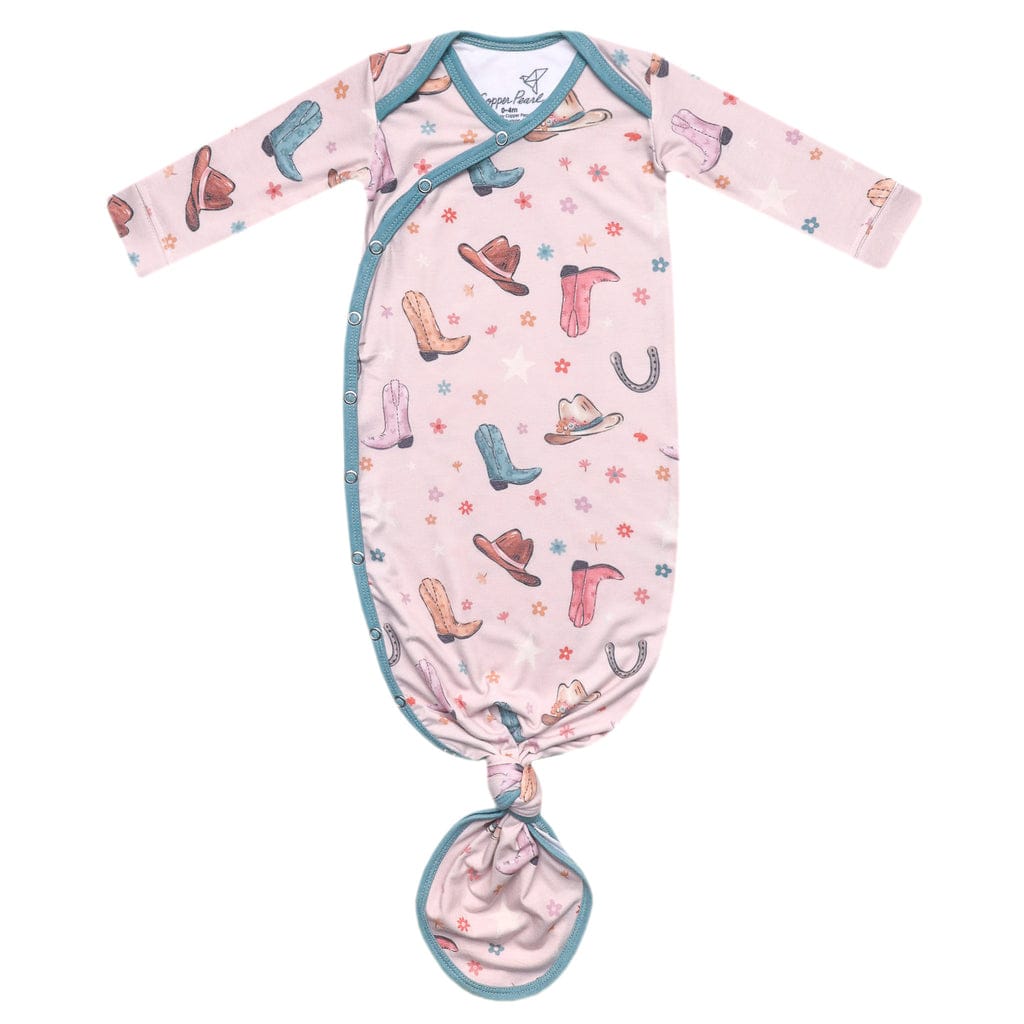 Make diaper changes a breeze and keep your little one cozy with Copper Pearlâs stylish knotted baby gown. Designed for newborns, this gown ties securely at the bottom and offers plenty of room for growing babies, making it both practical and adorable.