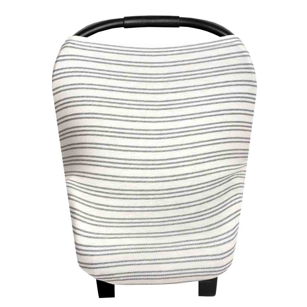 Stretchy fabric fits most all car seats, shopping carts, high chairs and nursing mothers. It can also be a trendy infinity scarf! The tan and white striped fabric is gender neutral and trendy
