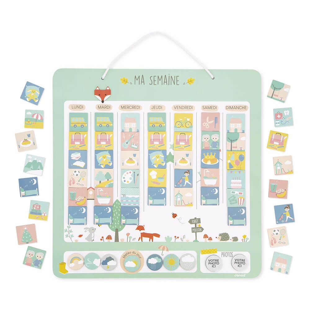 A cute fox head magnet marks the current day, helping little ones orient themselves throughout the week. There’s also a weather section with 7 illustrated magnets so children can observe and record the day’s weather.