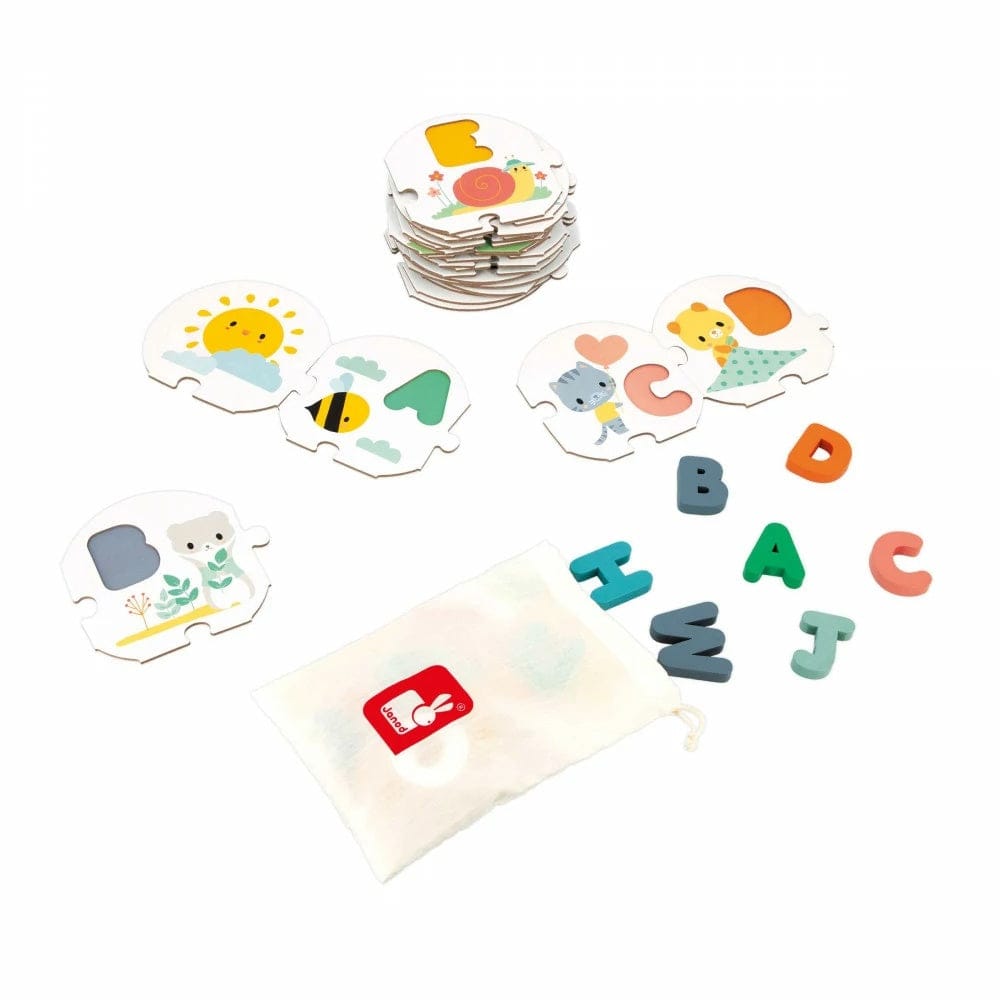 Encourage early learning through play with this 2-in-1 alphabet puzzle designed for young children. Kids begin by assembling the large illustrated puzzle, then match and arrange the colorful wooden letters in alphabetical order. Each piece features charming drawings of animals, insects, and objects to support vocabulary development in French. This activity helps build fine motor skills, memory, and early language learning while keeping little ones engaged and curious.