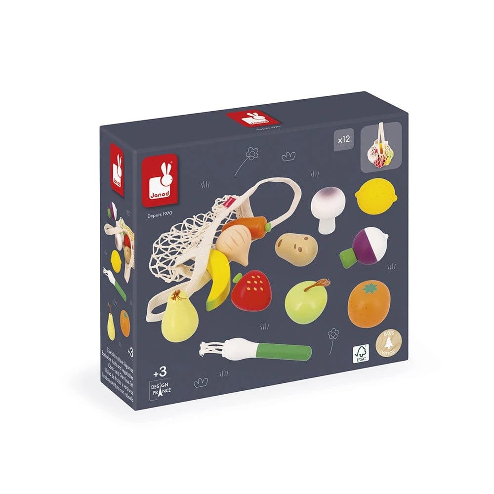 Bring the market indoors with this set of 12 wooden fruits and vegetables, designed for children aged 3 and up. Perfect for pretend kitchens, grocery stores, or dinette play, the set encourages imaginative cooking, role-play, and learning about fruits, vegetables, and seasons. All items come in a cloth net for easy transport and storage.