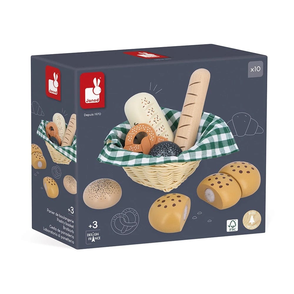 Delight little bakers with this charming wooden bakery set, designed for children aged 3 and up. The set includes a basket with six different breads and pastries, including a Velcro-divisible chocolate chip brioche, perfect for pretend play in the kitchen or bakery. This imaginative play encourages fine motor skills, role-playing, and everyday life imitation, letting children serve, share, and explore culinary creativity.