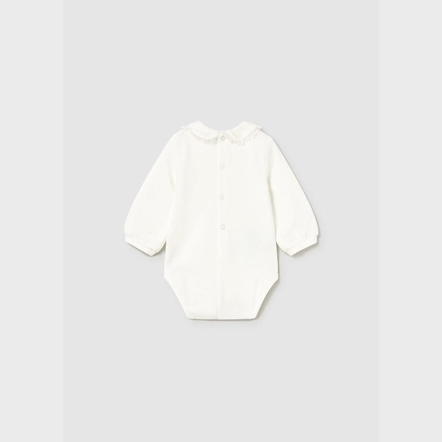 Long sleeved Bodysuits with elasticated cuffs for newborn baby girl. Baby neck. Back snap closure. Snap button fastening at crotch for easy dressing. Decorative elements: decorative ruffle.