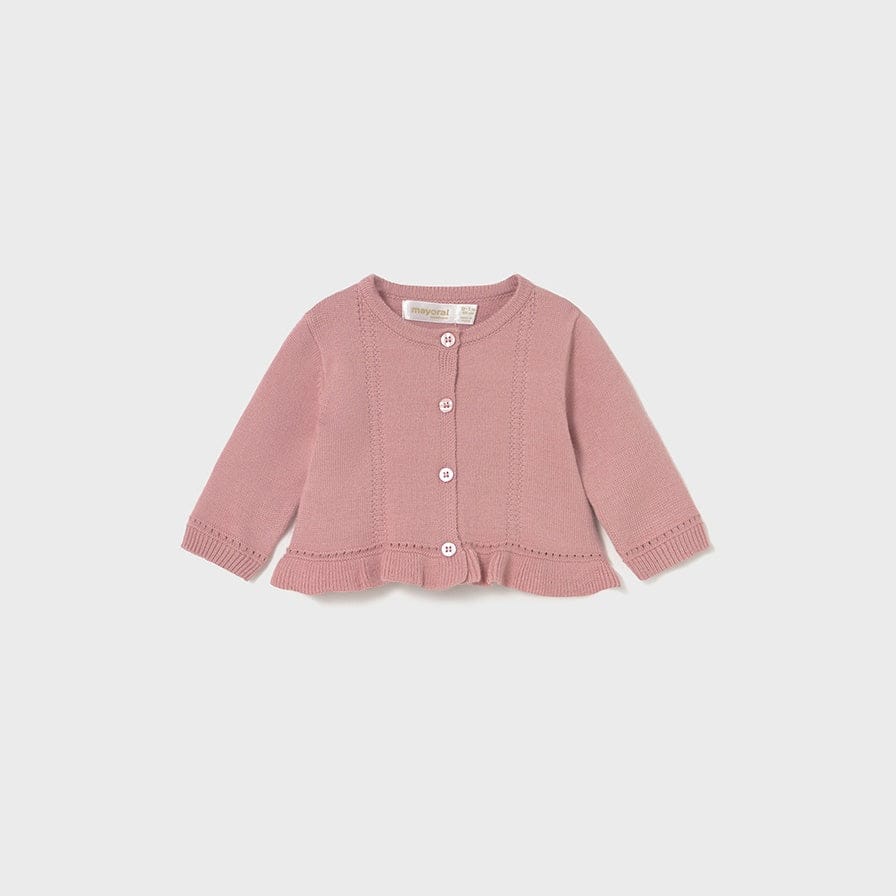 Long sleeved Cardigan for newborn baby girl. Round neckline. Button fastenings down the front. Design with a decorative ruffle at the bottom of the item.