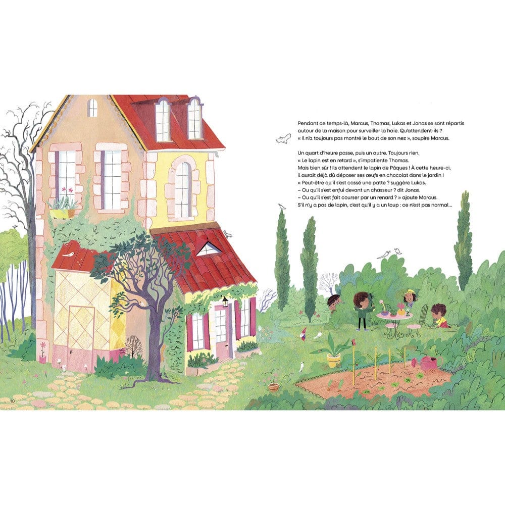 Ce matin-là, une joyeuse bande de cousins sort au courant de la grande maison familiale où ils passent leurs vacances et s'égaillent dans le jardin. Que se passe-t-il donc ? Y a-t-il le feu dans la cuisine ? Un serpent s'est-il introduit dans le salon ? Mamie s'est-elle mise à chanter ? Mais non, rien de tout cela : c'est le dimanche de Pâques, et ces gourmands attendent avec impatience l'arrivée… des œufs en chocolat !