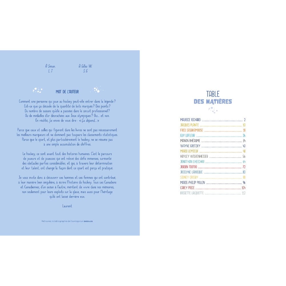 Dans la lignée du succès critique et commercial 15 femmes qui ont fait l’histoire du Québec et de 15 destins incroyables de l’histoire du Québec partez à la découverte de quinze joueurs et joueuses de hockey inspirants tant par leur carrière que par leurs personnalités !