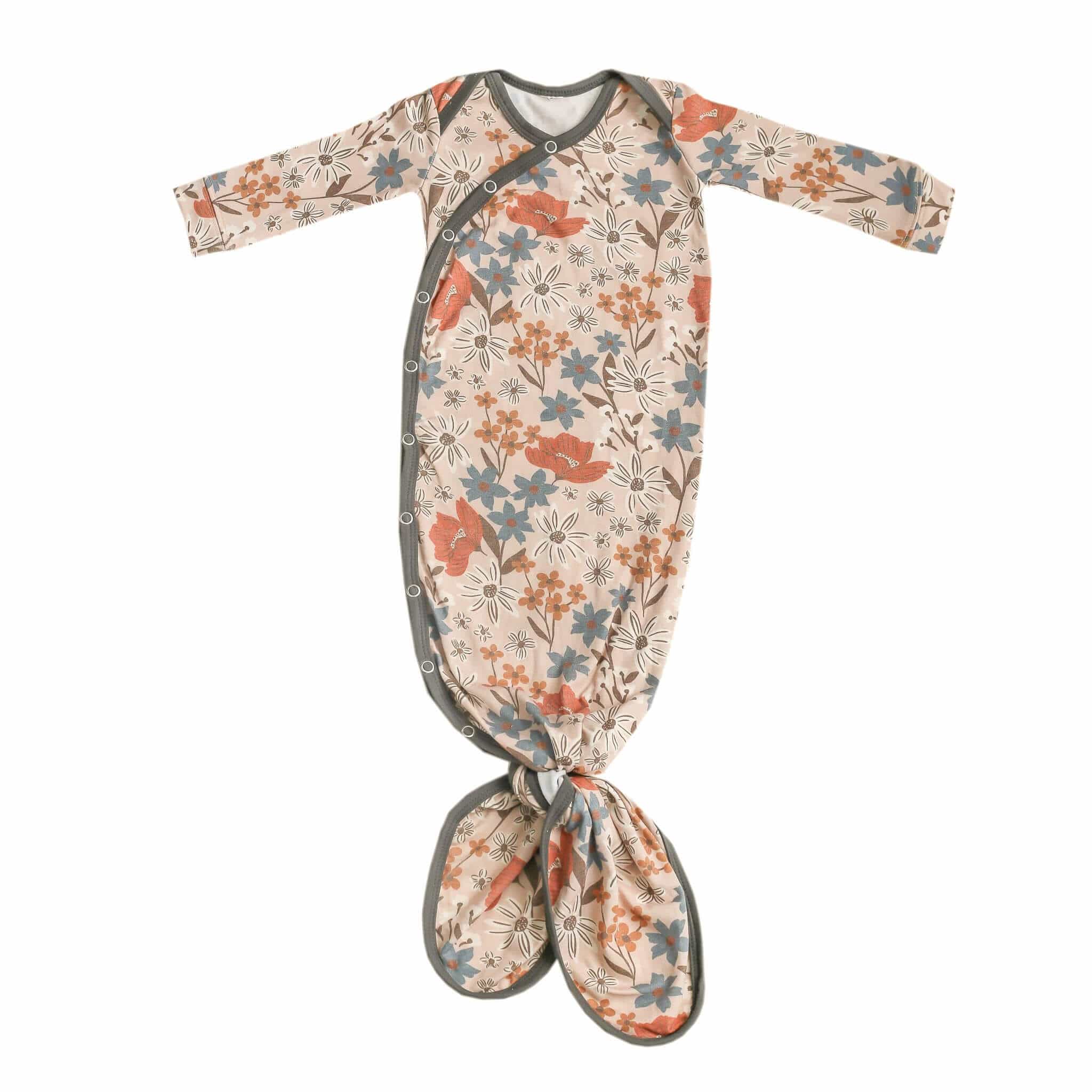 Make diaper changes a breeze and keep your little one cozy with Copper Pearl’s stylish knotted baby gown. Designed for newborns, this gown ties securely at the bottom and offers plenty of room for growing babies, making it both practical and adorable.