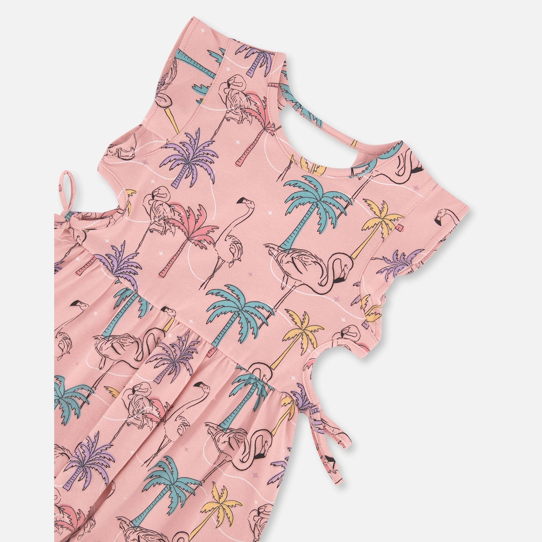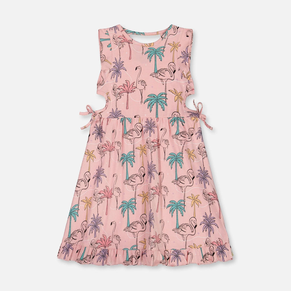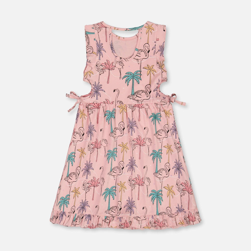 Cutout sides with little ties add ultra-girly style to our casual Printed Organic Cotton Dress with Cut Outs Palm Trees, Pink Flamingo, and Turquoise. This soft cotton jersey dress features an A-line silhouette with flutter sleeves, a round neckline, a cutout detail in back, and a colorful allover print. A frill at the hem adds the perfect finishing touch!