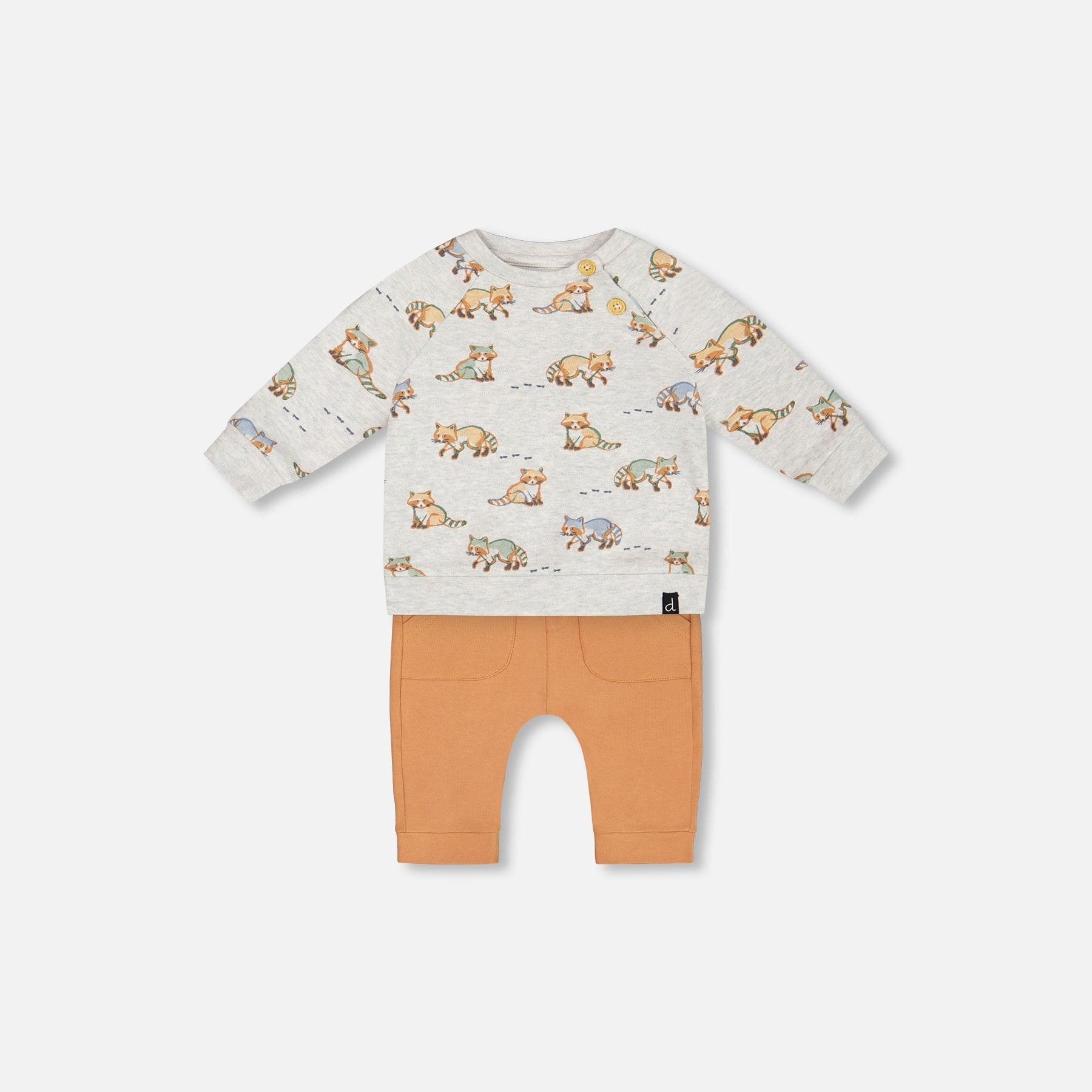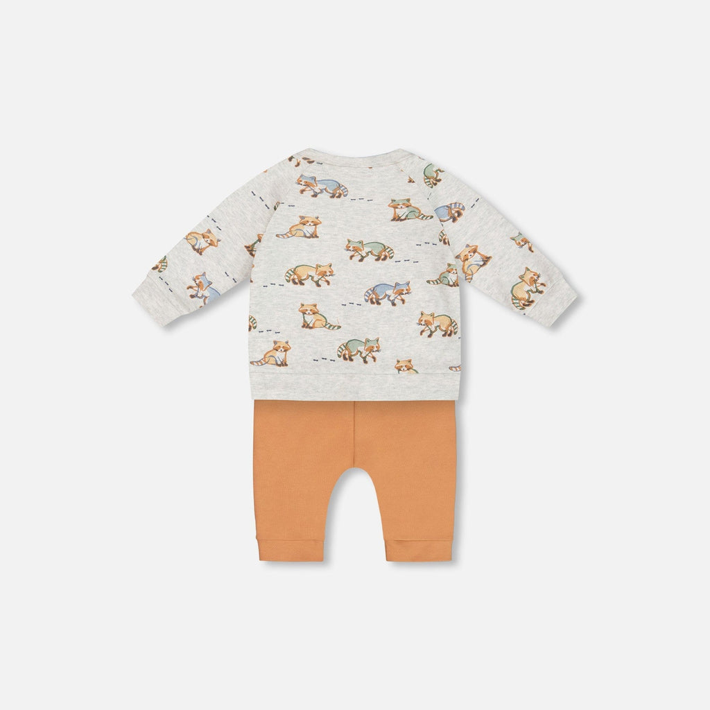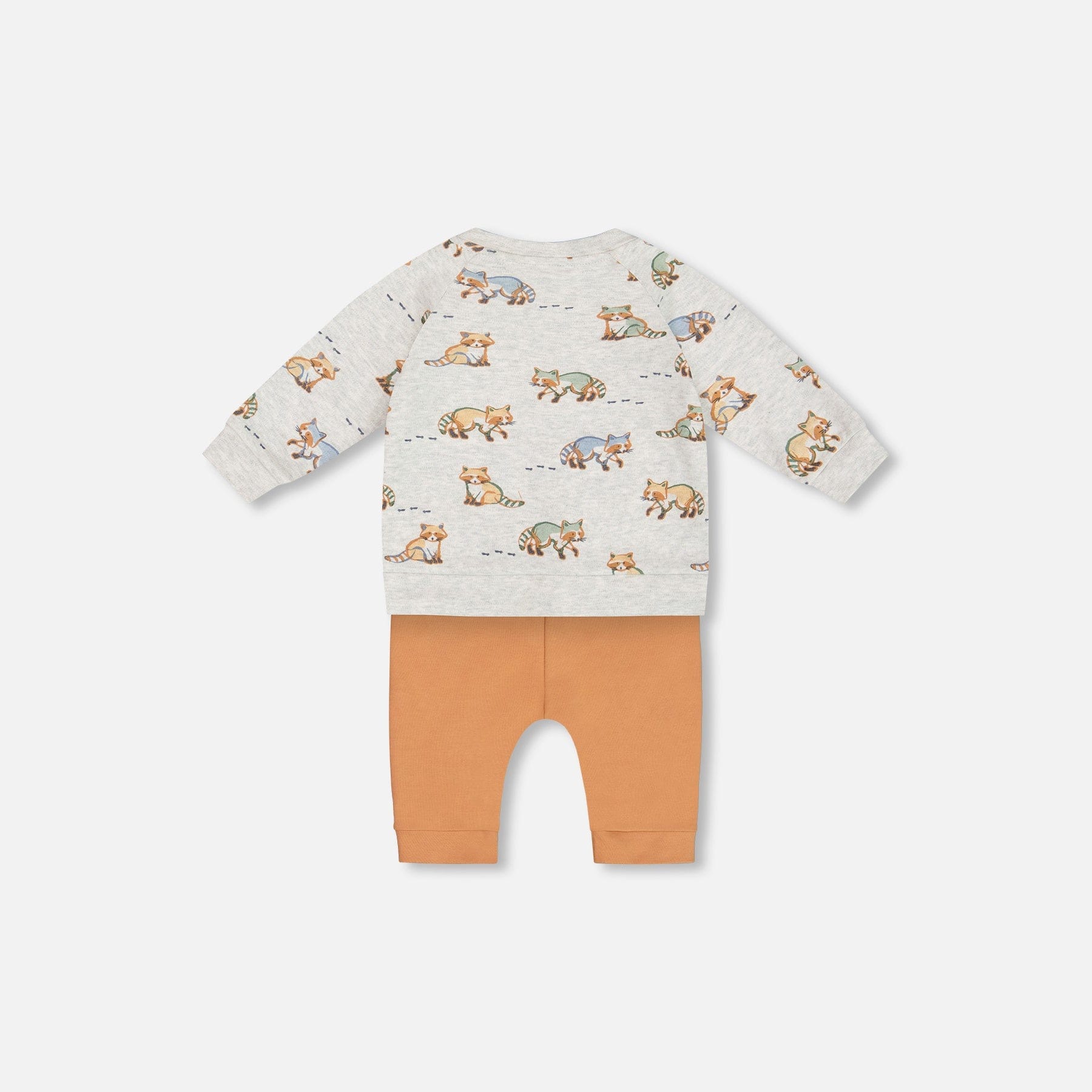 Ensemble haut et pantalon en coton biologique pour bébé fille en mélange beige avec imprimé raton laveur et noisette