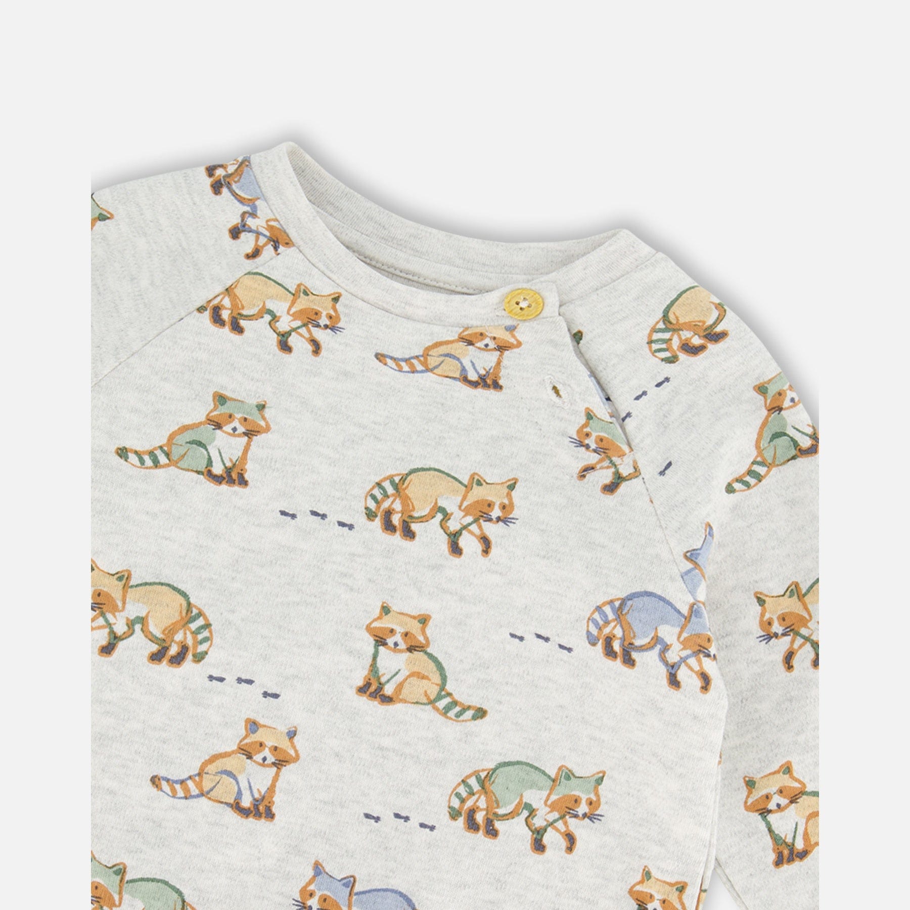 L'ensemble haut et pantalon en coton biologique Beige Mix présente un imprimé raton laveur vivant, ce qui en fait le choix idéal pour votre petit aventurier. Confectionné en coton doux, cet ensemble comprend un haut à manches longues avec manches raglan, une encolure ronde et deux fermetures à boutons. Associé à un pantalon à enfiler uni, avec une taille élastique, des poignets élastiques et des poches avant.