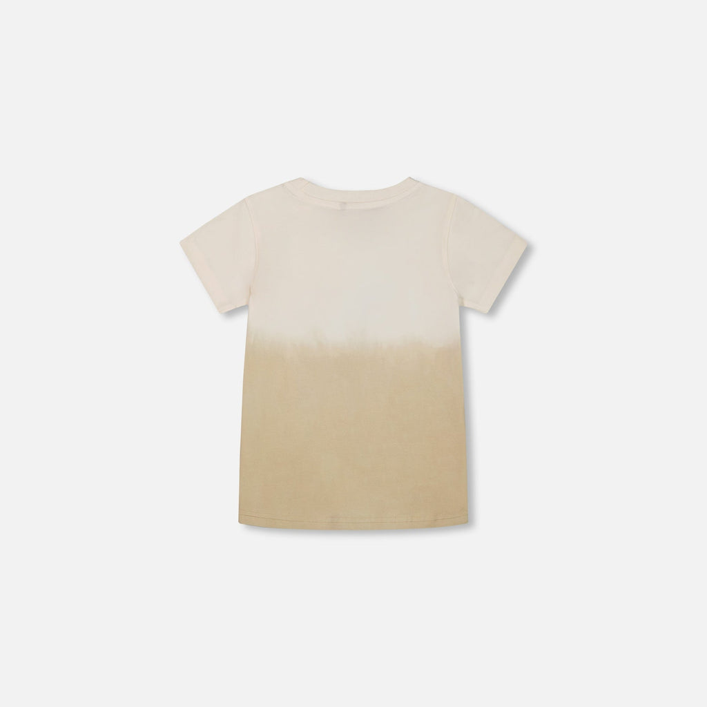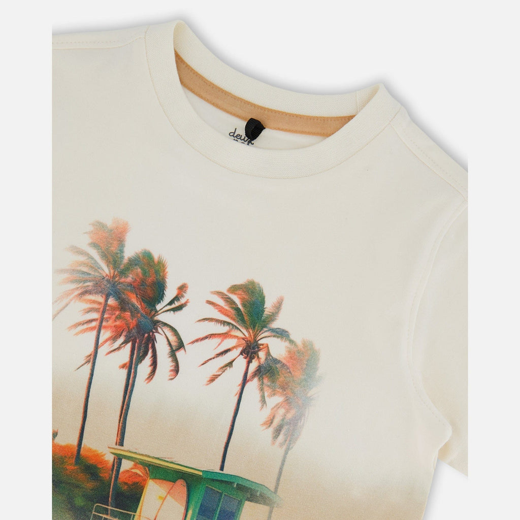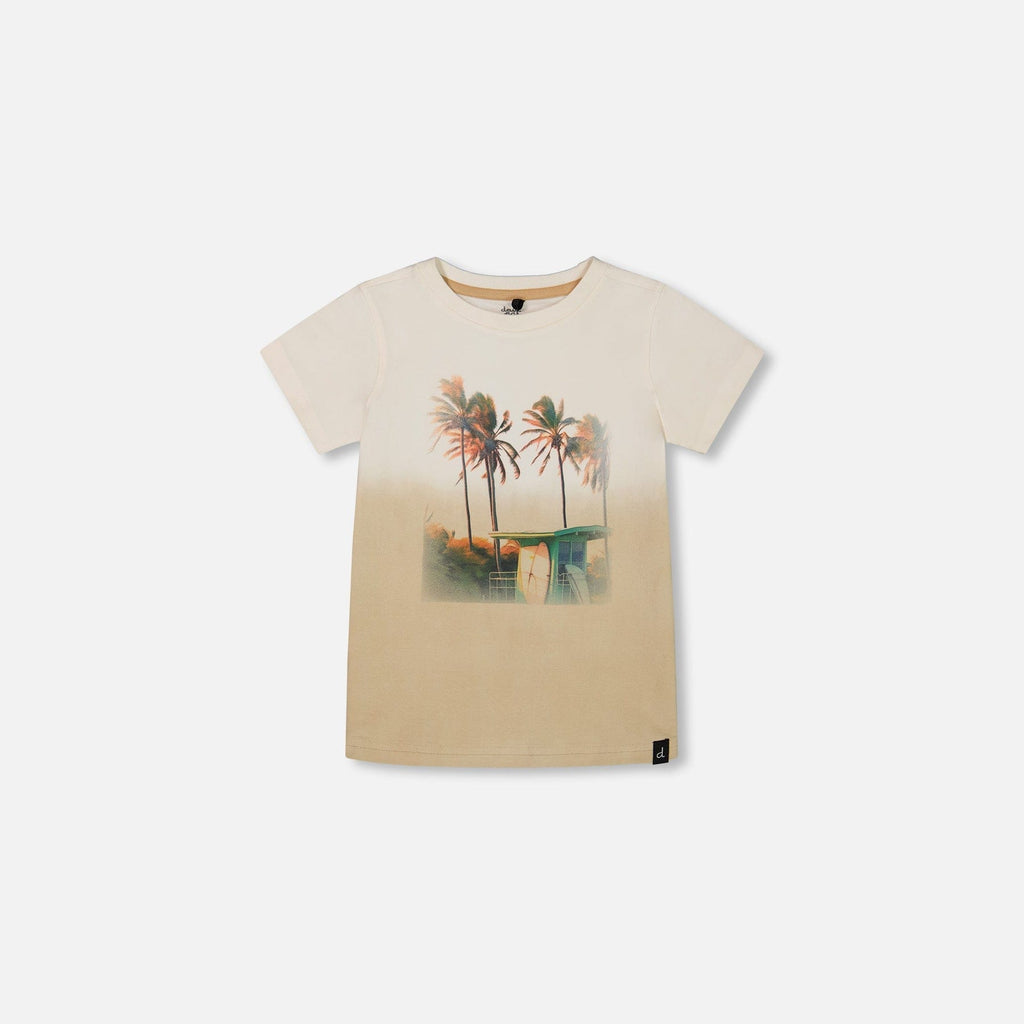Add a touch of California style to his wardrobe with our Short Sleeve Organic Cotton Graphic Tee Gradient White and Beige. This tee features short sleeves, a crew neckline, and a vintage Malibu photo print with a surf shack and palm trees. Team it with any bottom in our Malibu Sands collection for a playful head to toe look!