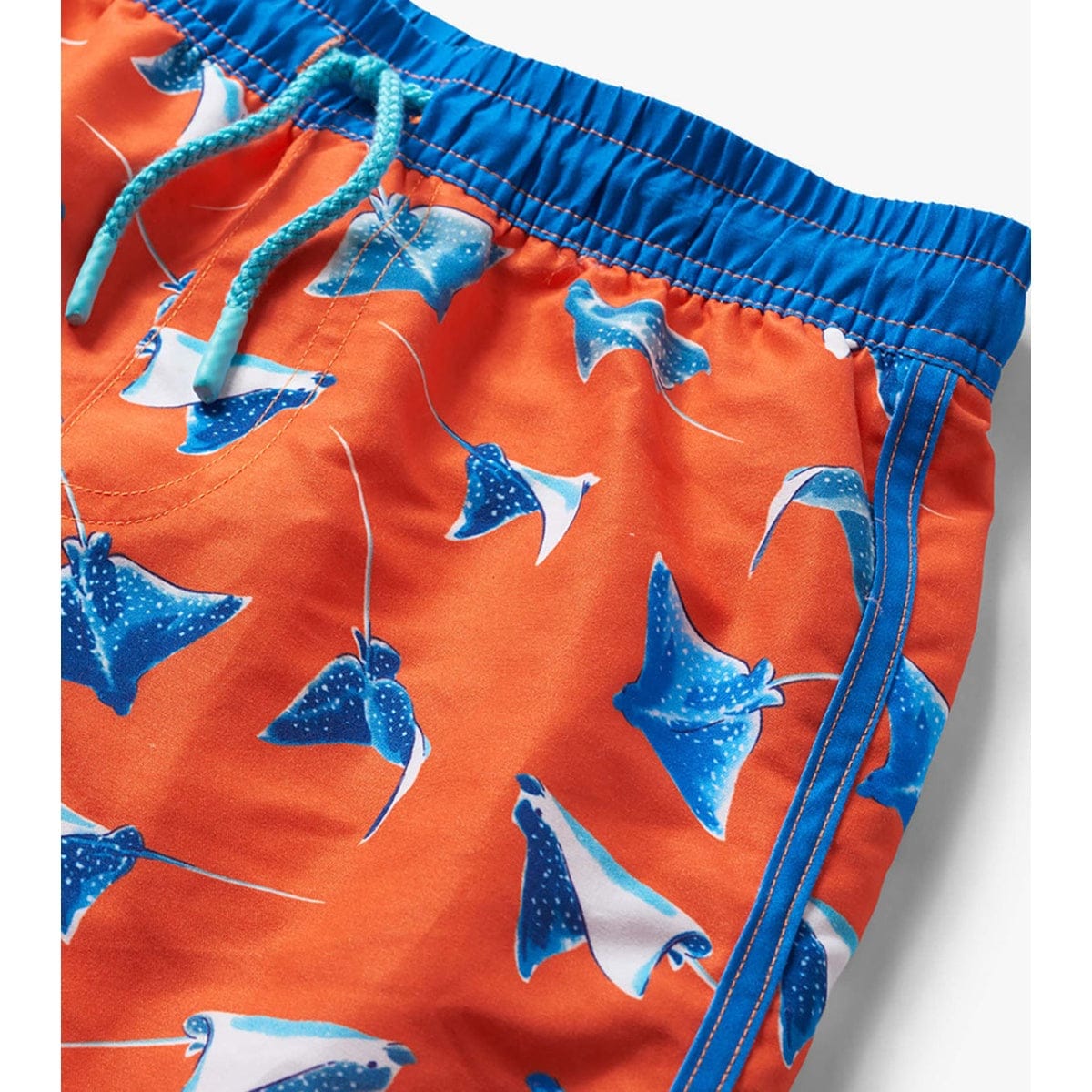 These vibrant orange swim trunks bring fun and function to every water adventure. Featuring an all-over stingray print, a contrasting blue waistband, and a light blue drawstring, they are designed for comfort, adjustability, and sun-safe play.