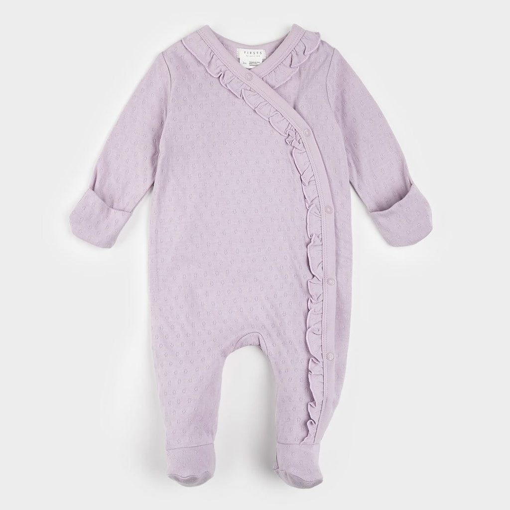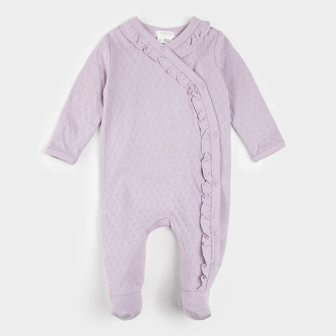 Cette grenouillère à bandoulière en iris est confectionnée en coton biologique de qualité supérieure, avec un charmant motif en maille pointelle et une bordure à volants le long des ourlets. Dotée de pieds intégrés pour garder les petits orteils au chaud, c'est un excellent choix pour la première tenue d'un bébé et un cadeau attentionné pour les futurs parents. Ne manquez pas le chapeau assorti de la même collection pour un ravissant ensemble assorti.