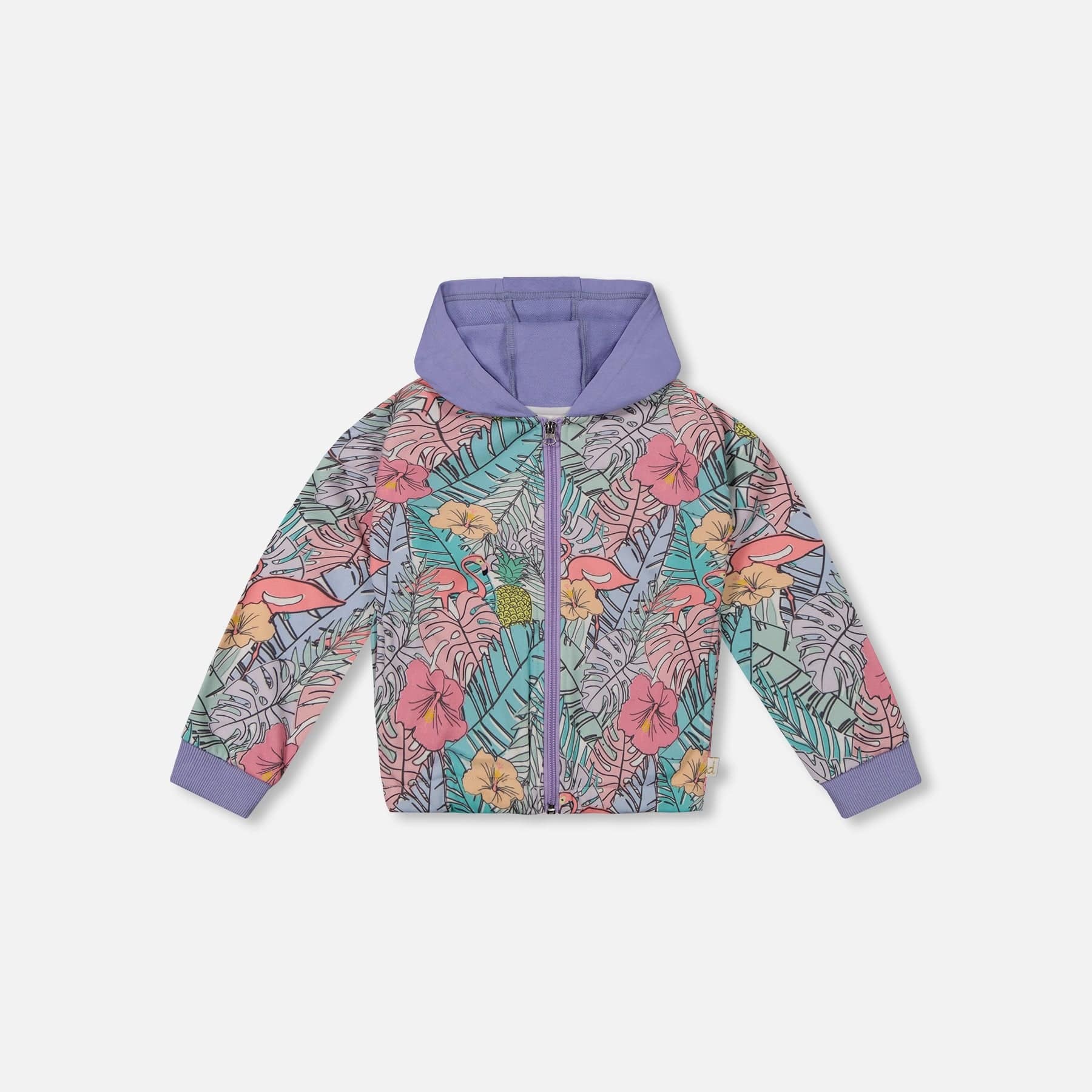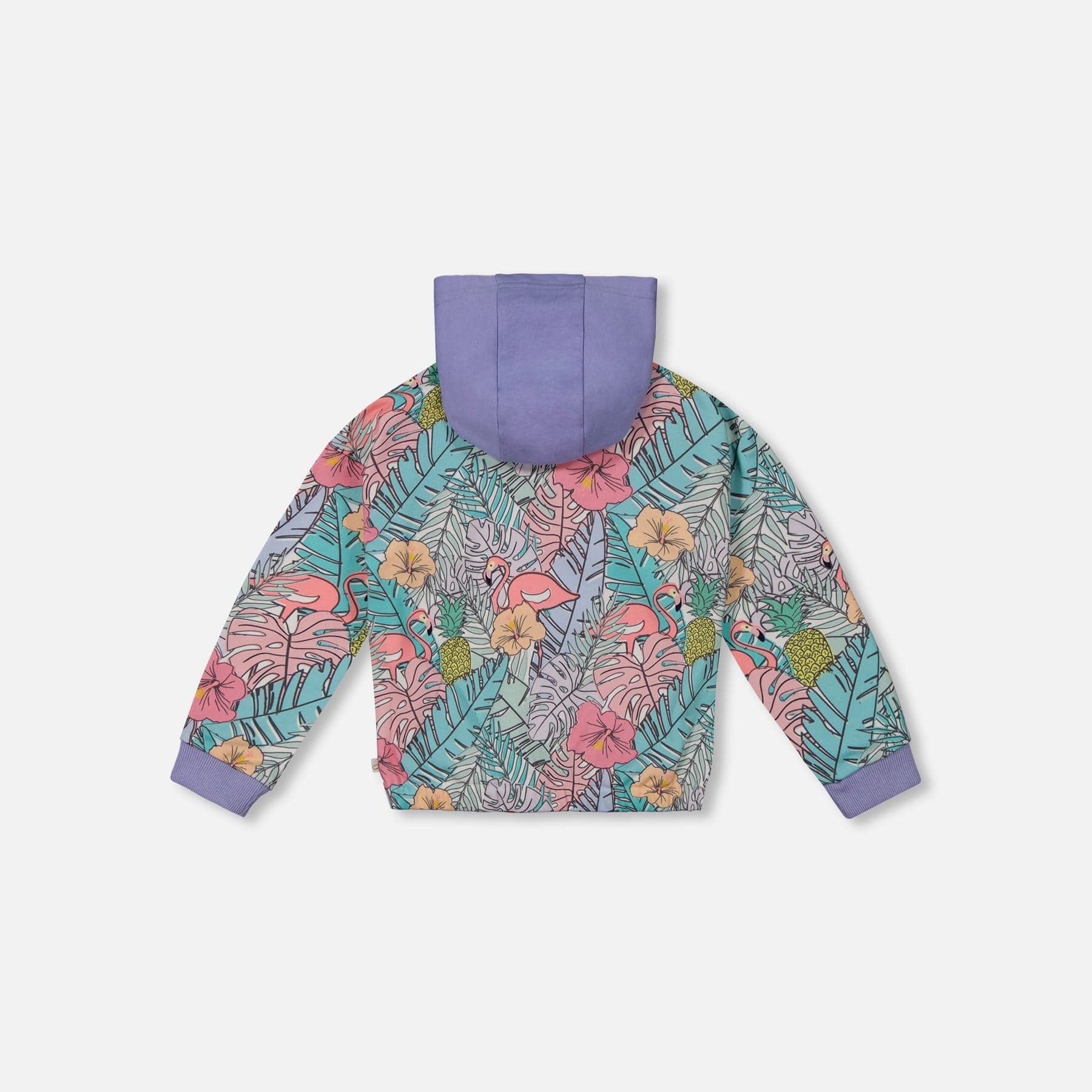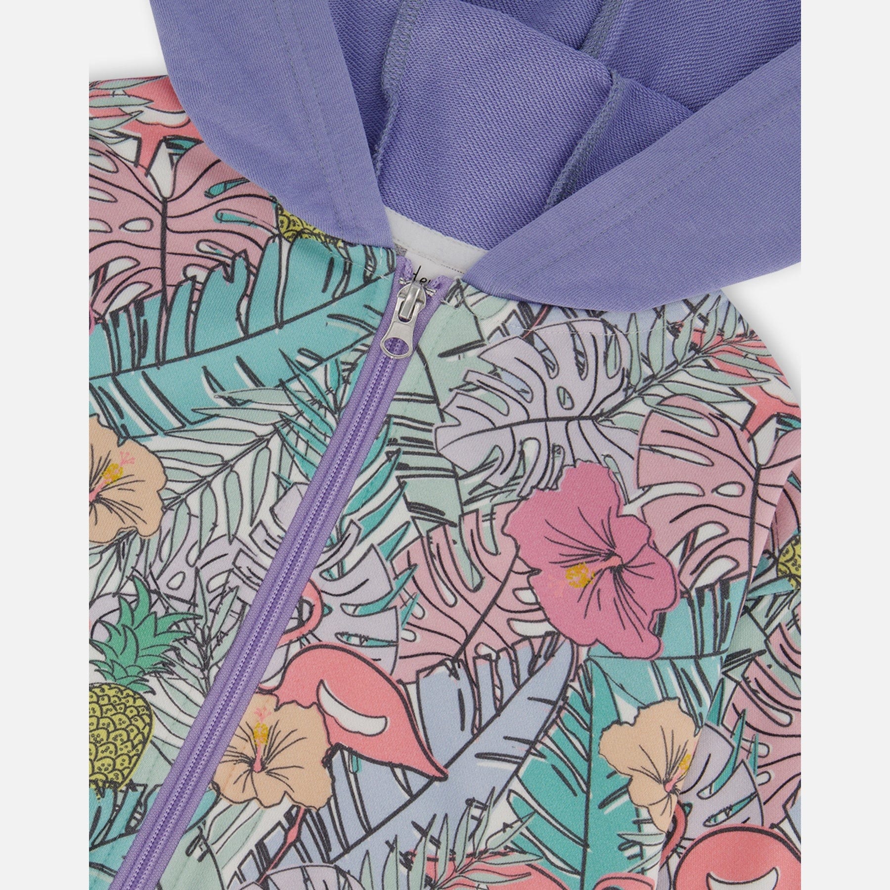 Our Printed French Terry Hoodie Cardigan Lilac Tropical and Pink Flamingos is the perfect way to layer up on a spring or summer day! This adorable hoodie is made from soft cotton/poly terry and features a long sleeve silhouette with a zip front closure, a colorful allover print, a solid lilac hood, and solid lilac cuffs at each wrist.