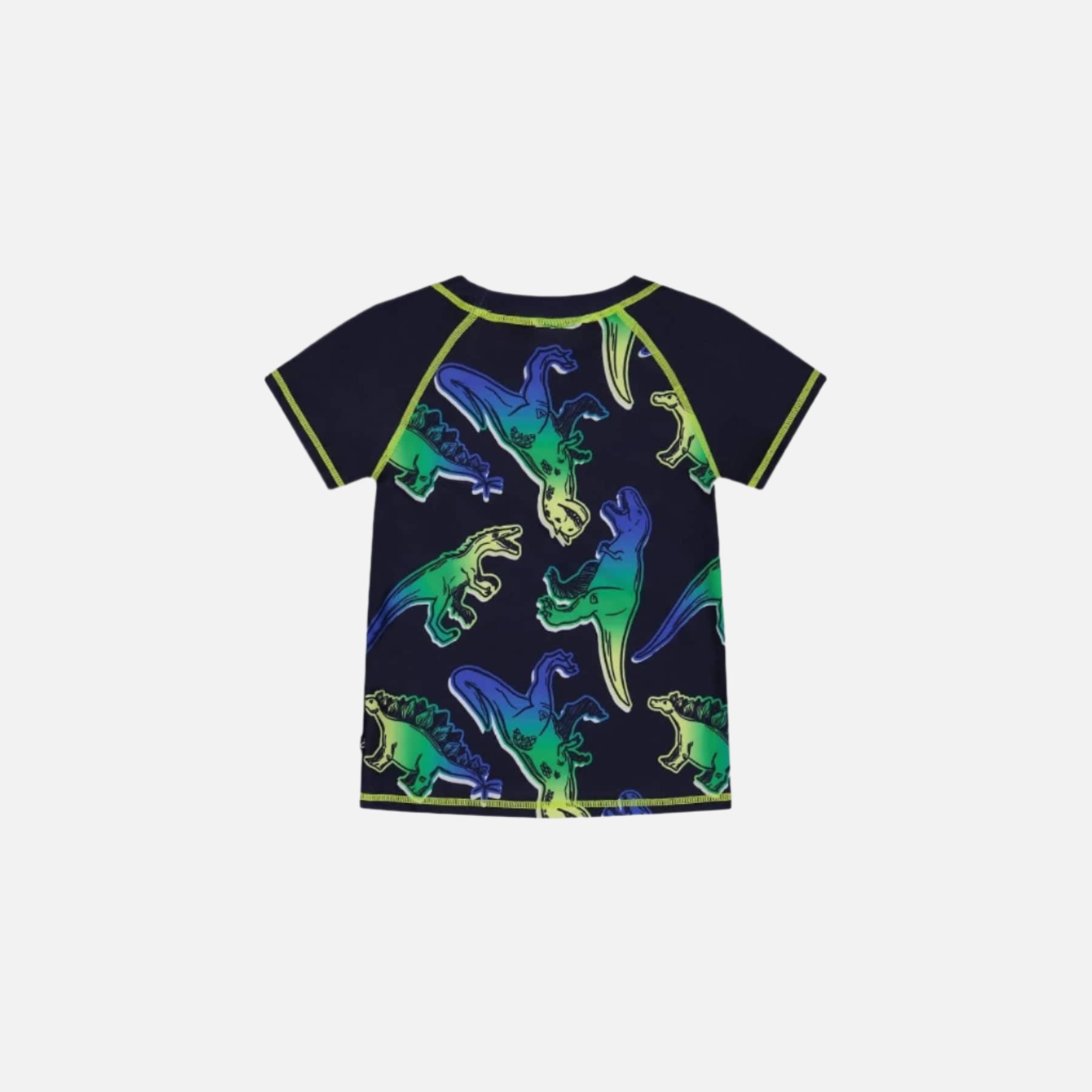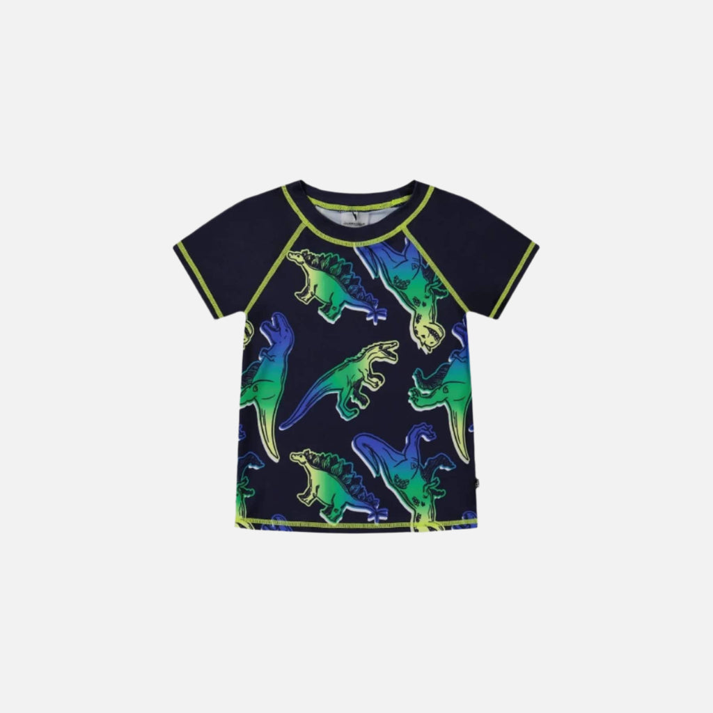 This Short Sleeve Rashguard has a lively dinosaur print in blue and green on navy, with UPF 50+ sun protection and contrast topstitching at the neck, sleeves, and hem. Its short raglan sleeves, and round neckline add to its bold, colorful design. This product is made from recycled plastic bottle fiber: REPREVE®