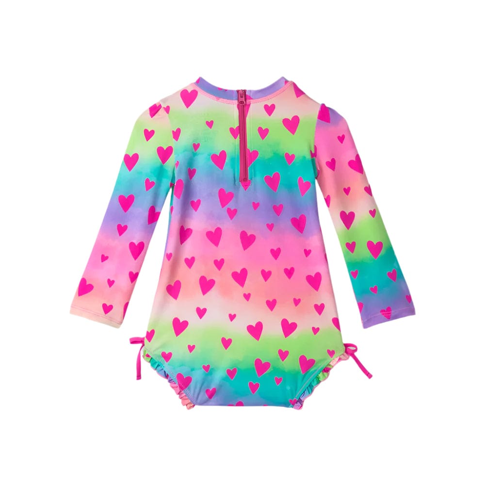 The Baby Girls Kaleidoscope Hearts Rashguard Swimsuit brings vibrant charm to water adventures with its cheerful heart pattern and practical sun-protective design. Perfect for the beach or pool, it keeps your little one cozy and stylish.
