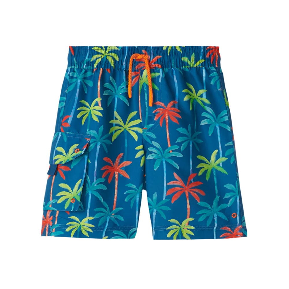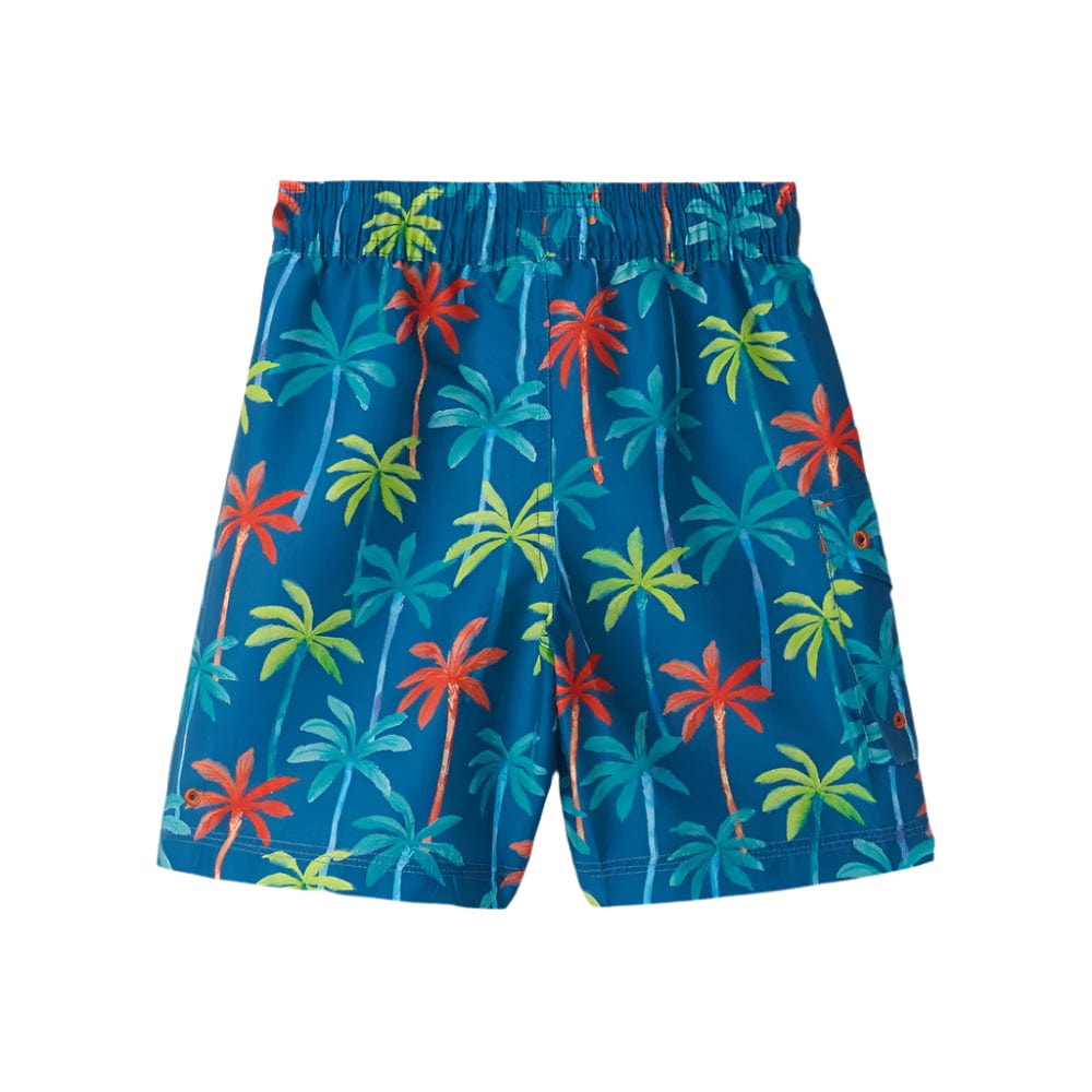 Let your little one enjoy the ocean breeze in the boys' printed palms board shorts! Featuring a vibrant star sapphire base with orange, green, and blue palm tree designs, these shorts are perfect for standing out during their next beach outing.