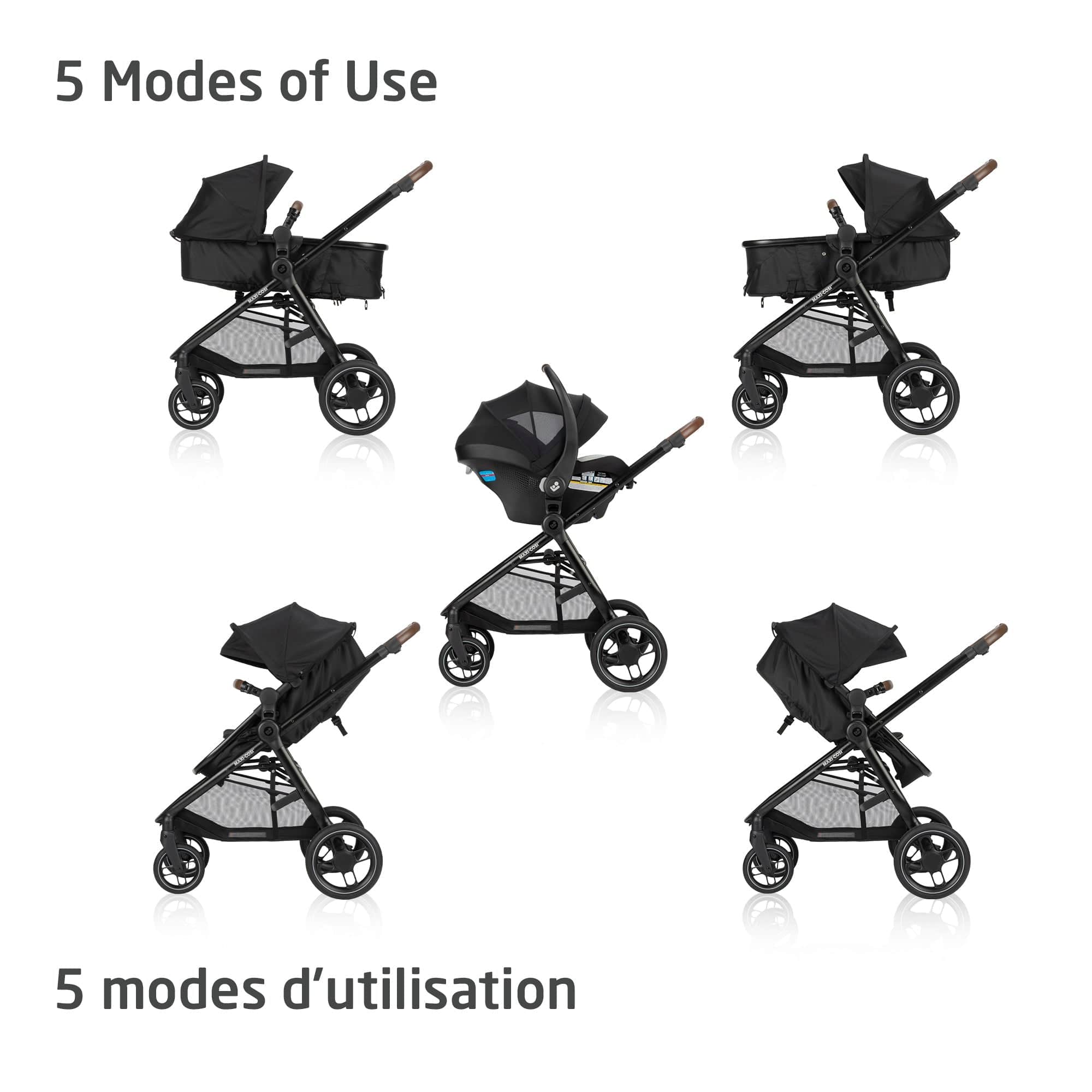 Modes: 5 (Carriage, parent-facing stroller, world-facing stroller, infant car seat + stroller, toddler seat)