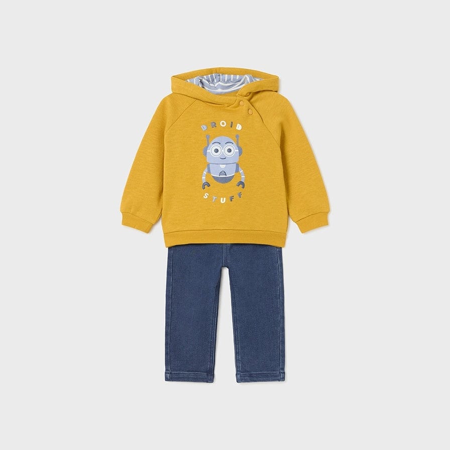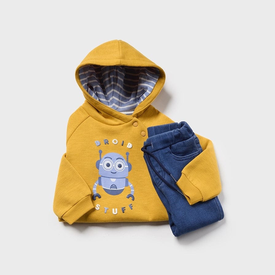 Matching Sweatshirt and Pants Set for Baby. Sweatshirt: This baby sweatshirt features raglan sleeves and a hood with contrast lining. It has a snap button closure at the front and is made from warm, thick fleece (brushed fleece), perfect for colder months. The hem and cuffs are made of elastic knit for a better fit, and it includes decorative elements like a front graphic and a puff print detail. Pants: The classic straight-cut (Regular fit) baby pants come with an elastic waistband and a drawstring for added comfort. Crafted from soft and comfortable stretch denim, they feature multiple pockets for practicality.