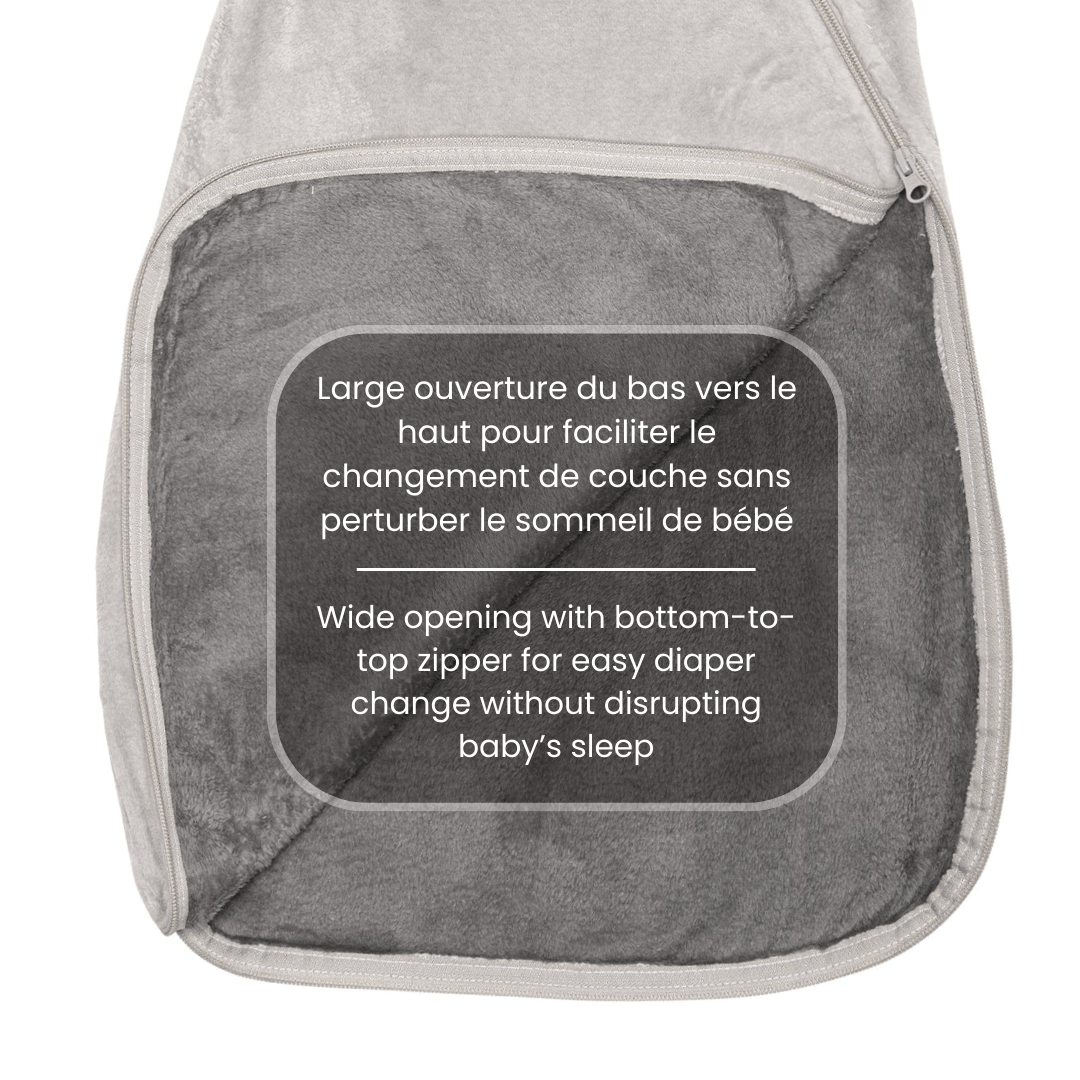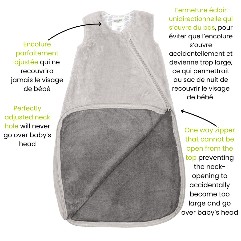 Teaching baby a healthy sleep routine is not always easy. Perlimpinpin sleep sack is the first step for a safe and restful sleep. With its reverse zipper, this safe sleep bag will make diaper changes very easy! Fully adapted to the cold Canadian winter, this plush sleeping bag will keep baby's feet warm. In addition to being super comfortable all night or daytime naps, your little treasure will also be very comfortable in his sleep bag as it allows a great freedom of movement.