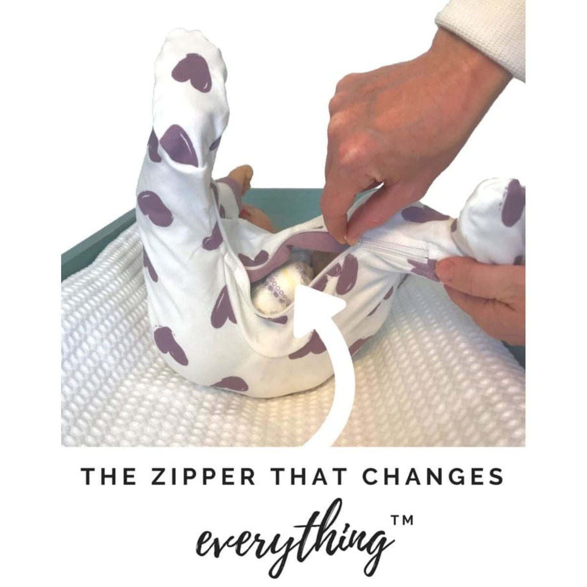 • 2 separate zippers make dressing and diaper changing quick and easy